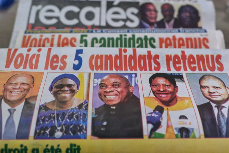 A general view of a newspaper with a headline showing (From L to R): Ivorian President and presidential candidate for Rally of Houphouetists for Democracy and Peace (RHDP) Alassane Ouattara, former Ivorian First Lady and presidential candidate for Movement of Capable Generations (MGC) Simone Ehivet Gbagbo, independent presidential candidate Don-Mello Ahoua, presidential candidate for Groupement des partenaires politiques pour la paix (GP-PAIX) Henriette Lagou, and presidential candidate for Democratic Party of Ivory Coast – African Democratic Rally Jean-Louis Billon, at a newsstand in Abidjan on September 9, 2025.